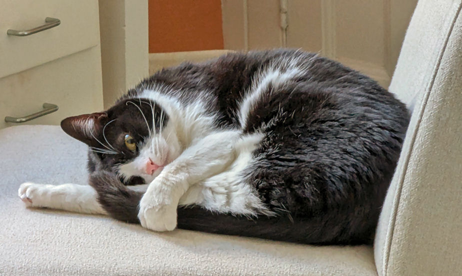August to Christmas In August Lily started sitting and snoozing on Jane's lap, and continues to do so daily, especially when Jane is wearing a towelling bathrobe. The best I've managed is her (Lily) snoozing against my thigh. Once. It's arguable that a bit of pairing has developed, as Minnie often comes to find me when I'm at the PC, for rubs and the traditional stomping on the keyboard. They still eat little but their biscuits, although Lily likes a bit of chip-shop fish, and is now usually to be found waiting on the dining table by the time we've unpacked our Deliveroo from the chip shop. She has also become what one might politely call a chunky cat (see photo right). When they are together stroking Minnie's head invariably starts Lily purring, which is sweet. Strangers in the house still make Lily run and hide, but although deliveries and Deliveroo drivers tense her up she now rarely makes it behind the sofa before they've gone, and if she does she's out and about pretty soon. For Minnie strangers in the house are mostly a cue for investigatory sniffing. Lily still likes chasing the laser pointer, and reflections generally and Minnie still likes to bring gifts and has a special tone of meow to signal this. These gifts are now mostly from the garden, usually bits of wood, or twigs, or the like. Squirrels and sparrows and pigeons are the sources of fascination and stalking and dashing, but no creatures, thankfully, had been presented until the first dead mouse on 30th December. But then on the 31st I had to deal with five baby mice in succession, all alive, and taken back into the garden, so the five might have included some repeat appearances. |