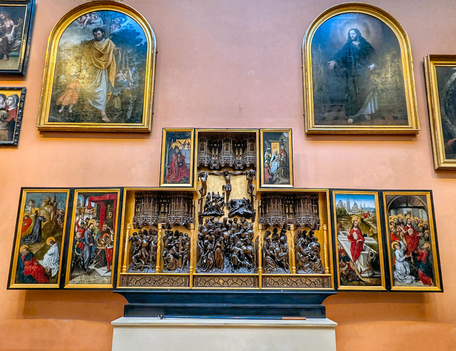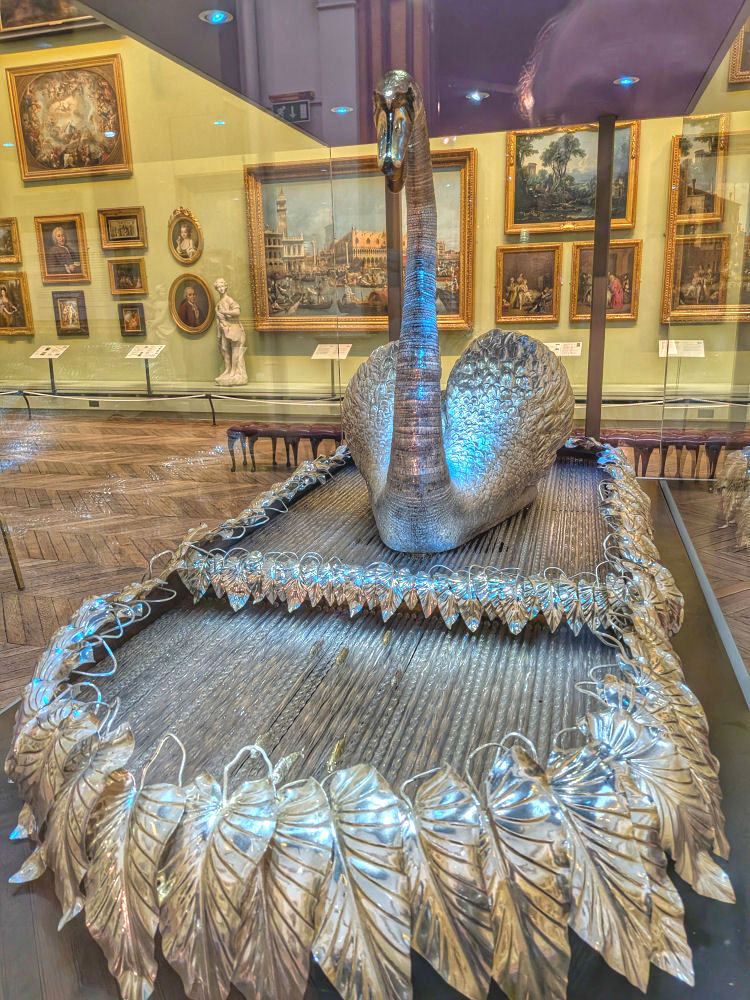 and both also apologised. The group reunited for a lunch in the tapas restaurant next door to the museum. The hummus, patatas bravas, cooked veggies and paella all went down well, but we couldn't eat it all. Our half group was then taken through the Spanish Art museum, with its somewhat eccentric arrangement and collection, but lots of good stuff. The last two rooms, containing the oldest art, were my favourites but we were running late so got rushed out. Aftertime enough for a good rest back in our hotel rooms we met up at 6.00 for Isabelle's final lecture, on Spanish art's influence and reception in Britain, followed by our final group meal in the hotel restaurant. It was fine, with mozza/tom bruschetti, rigatoni in a tomato suace and something they called tiramisu, but which was more like raspberry panna cotta with layers of sponge cake. Wednesday 1st April The bizarre lack of croissants at the hotel breakfast is matched by a lack of fresh fruit and plain yoghurt, although there is a gluten-free toaster. I mentioned the lack of croissants to a fellow traveller this morning and she pointed out that this was the North of England, so none of your soft southern breakfast pastries here, and that I was well north of the Croissant Line. After checkout, and amongst a flurry of eye test/Dominic Cummings jokes, we travelled by coach to Barnard Castle, to visit the Bowes Museum (above right). The top floor houses the art rooms, which are full of good, if not great, stuff, displayed floor to ceiling. usually four rows high. Lots of school of... pictures and copies, but an entertaining collection. Also entertaining is the 18th-century Silver Swan automaton (right)., which does it’s thing, for 30 seconds, at pre-announced times. We were also treated to the opening of the highlight large 15th-century Flemish altarpiece, by the Master of the View of St Gudule (below). We had independent lunches at the museum restaurant – mine was carrot and coriander soup and a round of triangular Wensleydale cheese and chutney sarnies - before being coached to Darlington Station for the 14:26 return train to Kings Cross. |