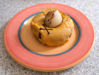 Bread 'n' Butter Pudding ...but this one also has the appearance and texture of having been made from slices of bread, soaked in milk, with sugar, raisins and spices (cinnamon and/or nutmeg). It is also eaten hot and, being pretty squidgy, is eaten with a fork and so is really more of a pudding than a cake. In times past it was a way for poor people to use up leftover stale bread. Now we have more money and buy bread 'n' butter pudding ready-made from supermarkets, with added cream. NB: The B'n'B pudding was photographed on a larger plate. |