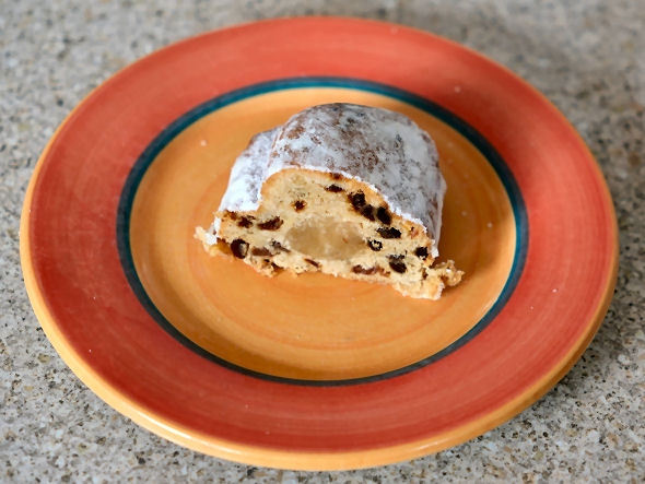 Stollen Following neatly alphabetically after the round English Easter cake with a marzipan centre and topping, comes the log-shaped German Christmas cake with a marzipan centre. Originating in Dresden it's known in Germany as Christstollen. It is said to symbolise the body of the baby Jesus wrapped in swaddling. Or icing sugar in this case. But it's also said that it was originally of Jewish origin, and eaten throughout the Hanukkah season. A Dresden court baker called Drasdo probably created the first fruity stollen around 1429. Online you'll find the suggestion that you might like to warm it up in the microwave or a toaster. I haven't tried this yet. Like Simnel Cake this is almost only available in its season. I got one on a trip to Dresden in August 2024, but, searching online later, found another Dresden baker that only takes orders from October. |