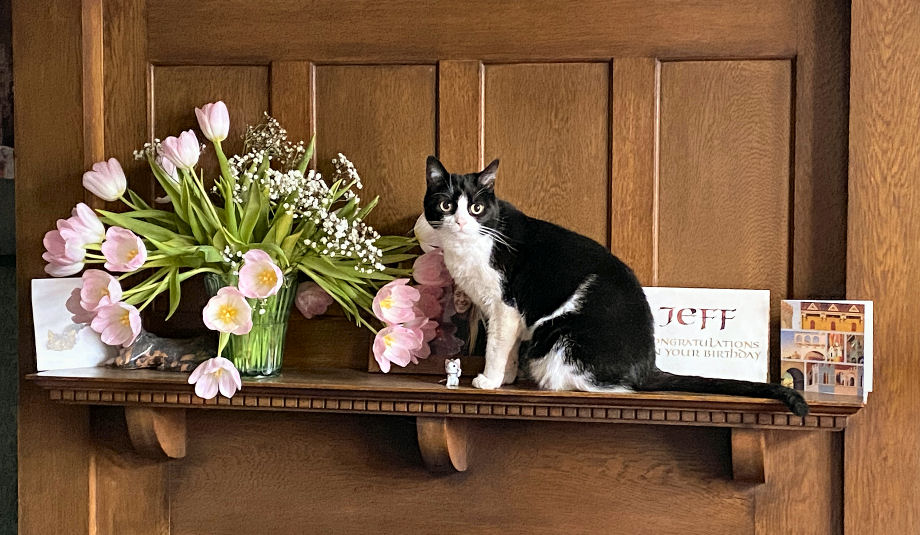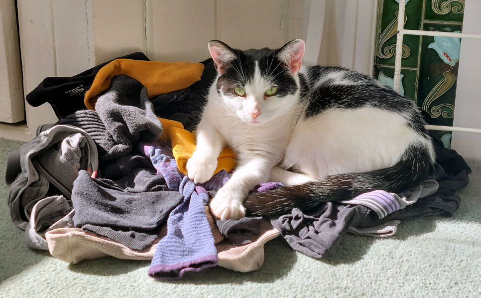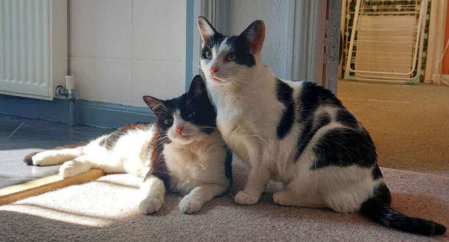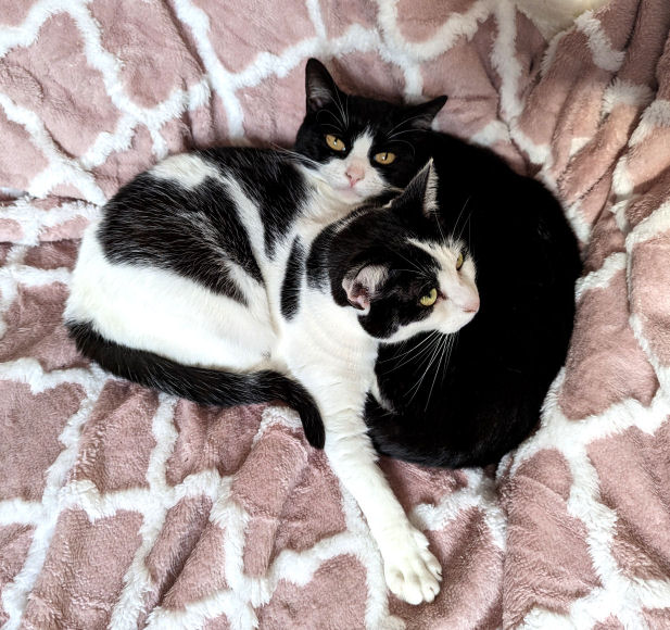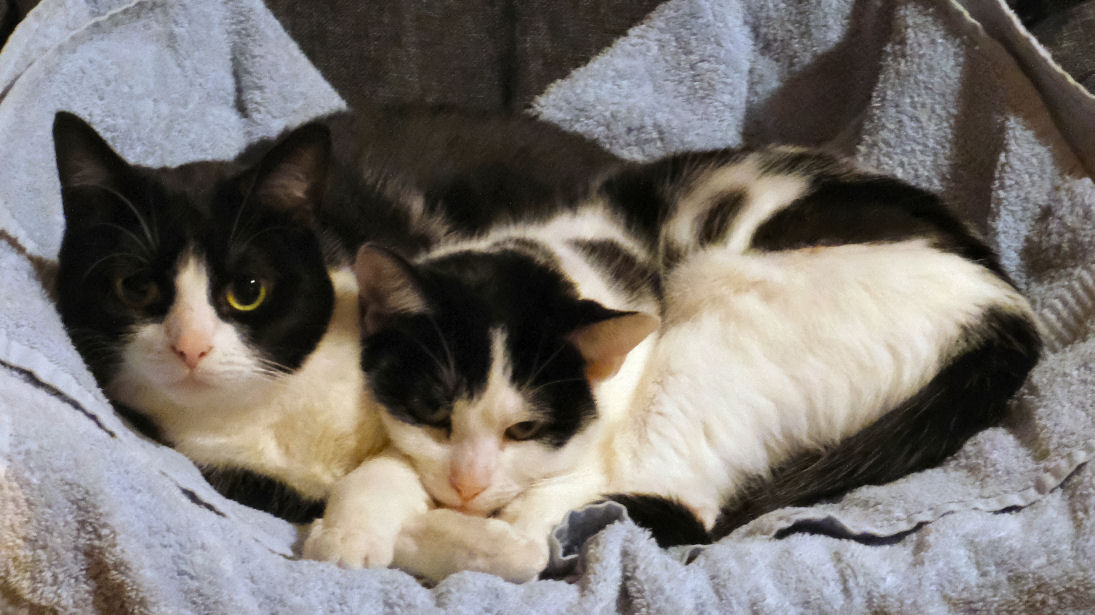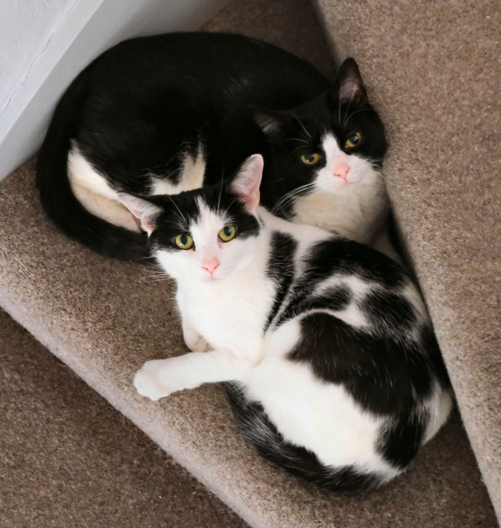 On the occasion of the second anniversary of the socially-distancing chap from Cat's Protection leaving Minnie & Lily on our doorstep the pair of them kindly posed for celebration portraits. They've settled in fine. Lily hides behind furniture hardly at all, and they both desire our company more, but not all the time, of course. Lily likes to chase lights, even more than before, and Minnie's habit of bringing us twigs persists. But nothing alive has been brought in since the multiple-mice event mentioned above.