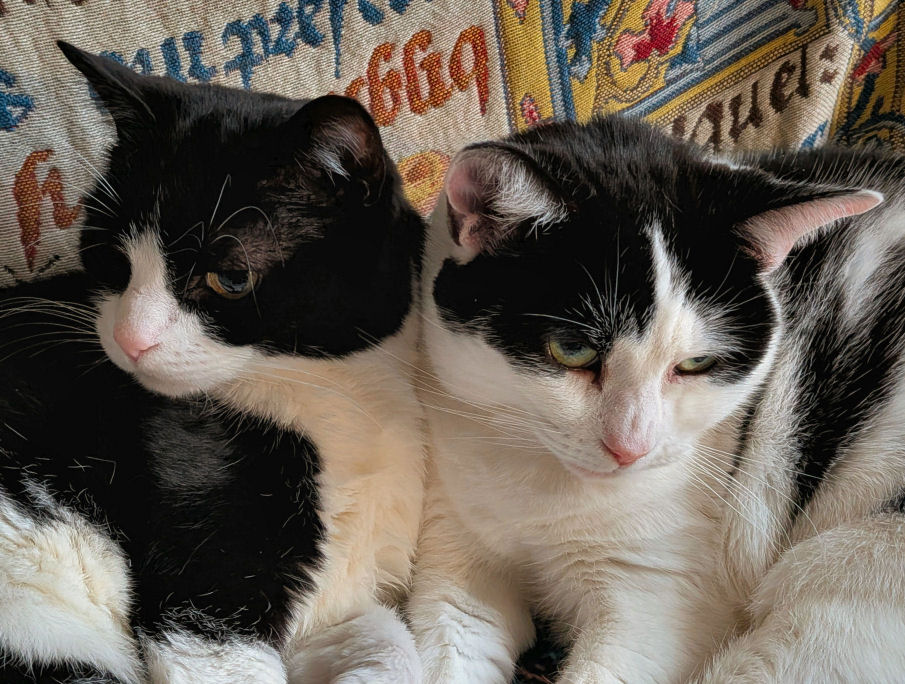 ![]() ![]() On the occasion of the second anniversary of the socially-distancing chap from Cat's Protection leaving Minnie & Lily on our doorstep the pair of them kindly posed for celebration portraits. They've settled in fine. Lily hides behind furniture hardly at all, and they both desire our company more, but not all the time, of course. Lily likes to chase lights, even more than before, and Minnie's habit of bringing us twigs persists. But nothing alive has been brought in since the multiple-mice event mentioned above.
