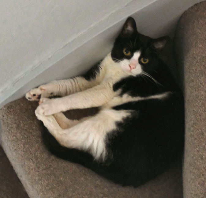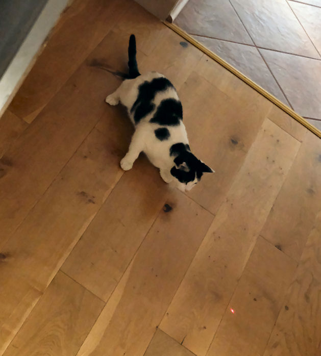 August to Christmas In August Lily started sitting and snoozing on Jane's lap, and continues to do so daily, especially when Jane is wearing a towelling bathrobe. The best I've managed is her (Lily) snoozing against my thigh. Once. It's arguable that a bit of pairing has developed, as Minnie often comes to find me when I'm at the PC, for rubs and the traditional stomping on the keyboard. They still eat little but their biscuits, although Lily likes a bit of chip-shop fish, and is now usually to be found waiting on the dining table by the time we've unpacked our Deliveroo from the chip shop. She has also become what one might politely call a chunky cat (see photo right). When they are together stroking Minnie's head invariably starts Lily purring, which is sweet. Strangers in the house still make Lily run and hide, but although deliveries and Deliveroo drivers tense her up she now rarely makes it behind the sofa before they've gone, and if she does she's out and about pretty soon. For Minnie strangers in the house are mostly a cue for investigatory sniffing. Lily still likes chasing the laser pointer, and reflections generally and Minnie still likes to bring gifts and has a special tone of meow to signal this. These gifts are now mostly from the garden, usually bits of wood, or twigs, or the like. Squirrels and sparrows and pigeons are the sources of fascination and stalking and dashing, but no creatures, thankfully, had been presented until the first dead mouse on 30th December. But then on the 31st I had to deal with five baby mice in succession, all alive, and taken back into the garden, so the five might have included some repeat appearances. |