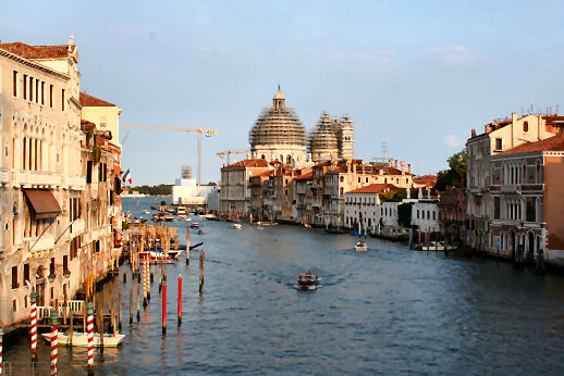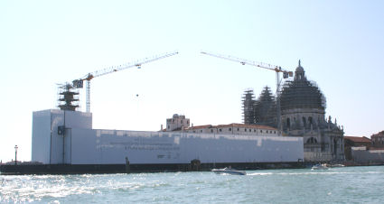 Wednesday 17th (I've resisted the temptation of that Jeff in Venice title for so long. It's a bad pun, I know, but it's also the title of a new novel coming out in 2009, so I thought that by using it I might also pick up a few confused searches later on.) Apart from the 5 o'clock wakeup my journey went without snags. The security-check queue at Gatwick was short and swift, but just as I was putting my belt back on after the scanning arch, and so about to attain trouser-security, I was asked to take my shoes off to put them through another x-ray machine and then an apologetic chap with a clip-board started asking me about my destination and the length of my trip. Phew! So, Venice in no time (well an hour and fifty minutes), no queue for bus tickets, and the only small blight the annoying man on the bus faffing loudly about paying a Euro too much for his bus ticket with a different company and then having an exhibitionist mobile-phone call to his secretary, so proving how important he is, even when he's just about to start his holiday. Pshaw! My hotel, The Locanda Gaffaro, is but a five-minute walk from Piazzale Roma. My room is not going to be ready until one o'clock, the chap with the unwarm manner tells me, so I ditch the case and the laptop and head out for some lunch and reassurance. I am soon reassured that Venice is indeed still special, and I buy an ordinary slice of pizza and sit in the campo by the Frari façade and eat it. Entertainment is provided by a chap with a guitar singing what sounds like a very early Eagles song, but which I eventually recognise as Wish You Were Here by Pink Floyd. Soon someone comes and sits and smokes near me, as they always do, so I move off. As I'm just aimlessly wandering my feet slip into the groove to the Rialto and then on up to the railway station. Near La Maddalena, in the main drag up to the station, from a place called Il Gelatone, I have my first gelato - fior di latte and lemon sorbet, and very subtle the flavours are too, especially the nicely un-sherbety lemon. In front of the station there's a weird huge free-standing staircase made of wood (see above right). I take some photos from it, just because I can. On my way back to the hotel I buy some Nicolotta Veneziana - basically Venetian bread pudding, but not so spicy. I notice that the controversial new Calatrava bridge is now open, so the stealthy non-celebratory opening happened after all. Pah! Back at the hotel the man with the borderline-surly manner books me in and my room is fine - not huge or plush but it'll do. It's down a short corridor behind the reception desk, which might be a noise problem, but I'll see what kind of a night's sleep I get. I brew myself some herb tea in my plastic tooth-mug (must get a proper mug) using the water-boiling thing I bought several trips ago and settle down for tea, cake and little rest. An early-evening walk to San Marco, of course, checking out the scaffolding on the way - the view towards the Salute from the Accademia bridge is now even more blighted (see right), there's unsightly stuff around the bottom of the campanile in the Piazza, the part of the front of the Doge's Palace where the chunk fell off is still all scaffolded over, and the Bridge of Sighs is hemmed around by an abomination of blue advertising hoardings. Sigh! |